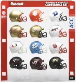 Teams includes in this set are: Boston College, Clemson, Duke, Florida State, Georgia Tech, Maryland, Miami, North Carolina, North Carolina State, Virginia, Virginia Tech, and Wake Forest. Pocket pro helmets are about 2 inches tall and come in a clamshell package that stands by itself. These are the new Revolution style helmets.